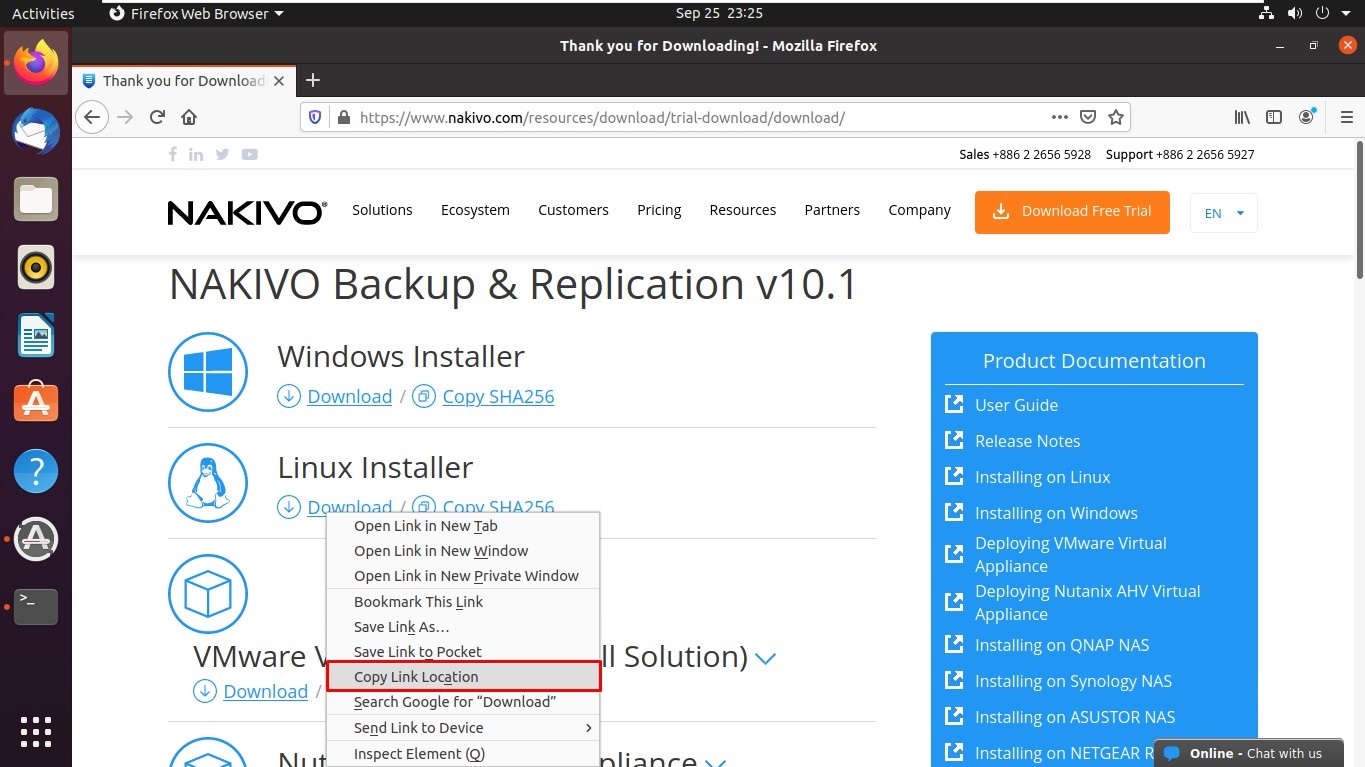 1. Petama, kita download dulu file NAKIVO Backup & Replication for Linux di web browser atau kalian bisa juga download lewat Terminal Linux. Caranya kalian klik kanan pada Linux Installer Download dan pilih Copy Link Location lalu copy kan ke Terminal Linux dan jangan lupa ditambah perintah wget untuk men-download.